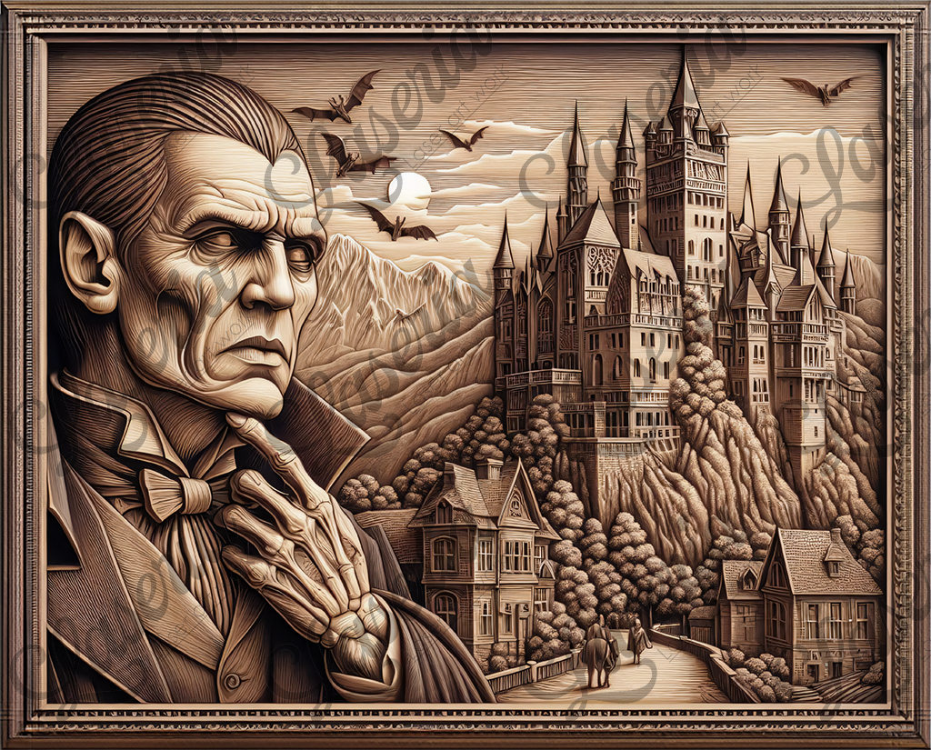 Wonderfully detailed design of Dracula portrait and his Castle in the background ready to be Engraved on your Laser machine to get a fabulous 3d optical illusion effect of a cnc routed art work.